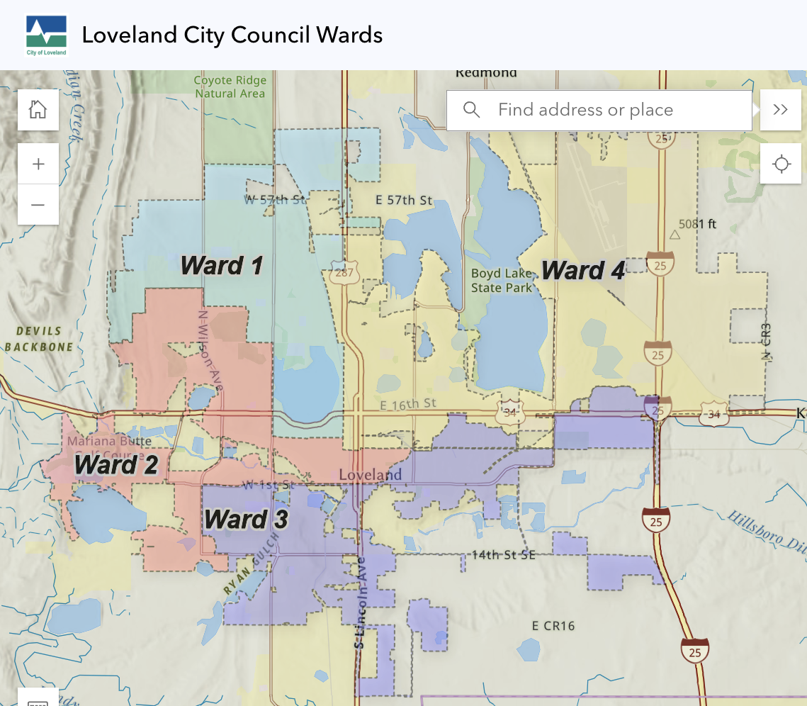 There are four wards in the City of Loveland. Find which ward you live in on the City of Loveland’s ward information page.